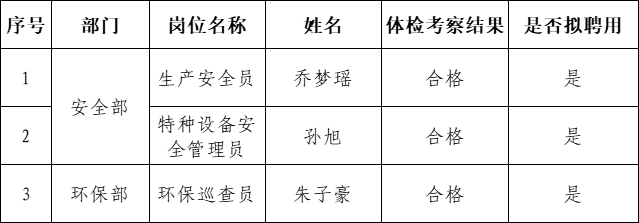 根據《關于招聘4名勞務派遣人員到郎溪開創印染產業園管理有限公司工作的公告》要求,按照“公開、平等、競爭、擇優”原則,經過報名、資格審查、面試、體檢、考察等程序,現將體檢、考察結果及擬招聘人員名單進行公示如下。